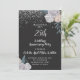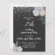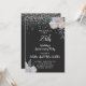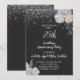 Una elegante invitación de aniversario de bodas de plata número 25 con brillo de plata en bordes florales de rosas blancas y negras y tipografía de letra blanca.