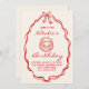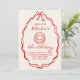 Si buscas una elegante y fácilmente editada invitación para cumplir 30 años, ésta es perfecta para ti. Como ven, presenta un guión escrito a mano roja con un nombre caprichoso y una redacción de cumpleaños con fondo rosa retro. Con la colorida tarta roja dibujada a mano y dentro la 30ª . Y un marco ondulado de cinta roja dibujada a mano. Y RSVP en la parte de atrás. Con toda la información que se puede personalizar fácilmente haciendo clic en el botón de personalización. Esta invitación rápida y única de moda para el cumpleaños también es una invitación electrónica digital si quieres enviarla por correo electrónico o por texto. Así que agárralo y haz que tus invitaciones estén verdaderamente comprometidas.