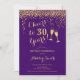 30.ª Invitación de cumpleaños. ¡Salud A 30 Años! Elegante diseño en morado y dorado. Incluye gafas de champán, letra de guión y confeti. Perfecto para una elegante fiesta de 30 años. Personaliza con tus propios detalles. Se puede personalizar para mostrar cualquier edad.