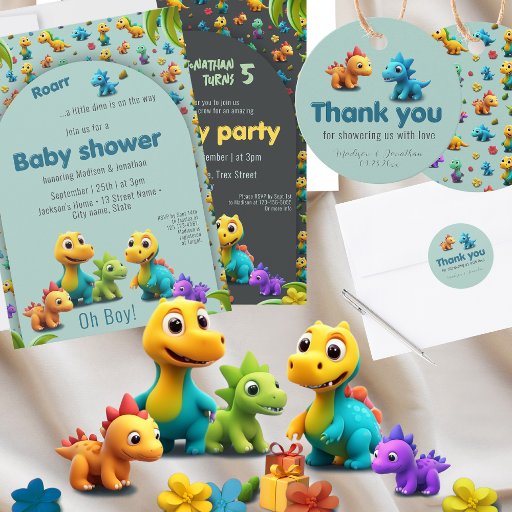 ¡Esta super linda invitación para el primer cumpleaños es la manera perfecta de invitar a todos tus pequeños amantes de dinosaurios a la fiesta de cumpleaños de tu hijo! Con adorables figuras de dinosaurios 3D en un elegante fondo negro arqueado, es un éxito total tanto para niños como para adultos. Ya sea que planee un fiesta para un niño o un viejo hincha de dinosaurio, esta invitación será un éxito.