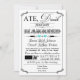 Este estilo del poster del vintage "comió, bebió y consiguió" tipografía casada de la recepción de la poste-boda que la invitación blanco y negro del boda de la MIRADA de la pizarra tiene una variedad de fuentes y de volutas en él, junto con un par de corazones de la aguamarina y de manos azules el señalar. Hace que una nueva toma divertida en "coma, beba y sea" la tendencia casada que es perfecta para los pares jovenes del inconformista, los pares gay con dos novios, o los pares que quieren una invitación verdaderamente original del boda que sea recordada por todas sus huéspedes. Se muestra aquí en el papel básico. Se modifica para requisitos particulares fácilmente con su propia información. Hay un poco de texto adaptable que usted puede corregir la manera que usted requiere. TAMBIÉN, observe por favor que todo imprimirá como aparece en su monitor. Zazzle no corregirá cualquier cosa para los errores tipográficos o el desalineamiento etc., y no lo veré una vez que usted lo ha pedido. Si usted necesita ayuda con su fraseología, envíeme por correo electrónico por favor ANTES DE QUE usted ordene. Si hay algunos otros artículos que usted necesite hacer su acontecimiento extraordinariamente especial, envíe por correo electrónico por favor su petición a niteowlstudio@gmail.com.