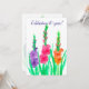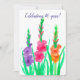 Una invitación de fiesta de aniversario de boda floral decorada con tres vibrantes flores de gladiolo en púrpura, rosa y naranja con hojas verdes brillantes pintadas a mano con acuarela. En el Lenguaje de las Flores Gladiolo significa "me traspasas el corazón" y fuerza de carácter. También es la flor tradicional del 40º aniversario.