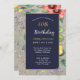 Dibujo botánico vintage con flores silvestres en tu 40ª Invitación a la fiesta de cumpleaños en colores rosa, amarillo, rojo incluyendo amapola roja, flores amarillas, plantas silvestres lavanda. Colocado sobre papel duro floral hecho a mano (estilo de impresión). El fondo azul oscuro oscuro y oscuro es muy fácil de leer.