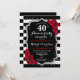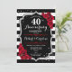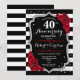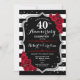 Invitación de cumpleaños de bodas de rubí rojo 40 aniversario. Tarjeta de invitación elegante roja, negra y blanca con brillo plateado falso. Cuenta con rayas negras y blancas elegantes, fuente de escritura y rosas rojas. Perfecto para una celebración de 40 aniversario.