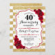 Invitación de cumpleaños de bodas de rubí rojo número 40. Tarjeta de invitación elegante roja y blanca con dorado falso brillante. Cuenta con rayas elegantes, fuente de escritura y rosas rojas. Perfecto para una celebración de aniversario número 40.