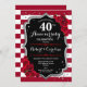 Invitación de fiesta de aniversario de bodas de rubí rojo 40. Tarjeta de invitación elegante roja, negra y blanca con brillo plateado falso. Cuenta con rayas elegantes, fuente script y rosas rojas. Perfecto para una celebración de aniversario de 40 años.