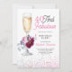 Moderna y elegante 40 y fabulosa fiesta de cumpleaños con una copa de champán floral, un rociado de purpurina y tipografía caligráfica rosa y negra.