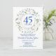 Una guirnalda decorativa de laurel rodea un borde circular que contiene tipografía azul zafiro de aniversario de 45 o 65 años. Debajo de los detalles de su evento de aniversario se establecen en texto clásico elegante. El reverso presenta los nombres de la pareja casada dentro de una guirnalda floral a juego. Diseñado por Thisisnotme©
