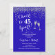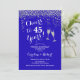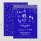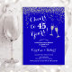 Invitación de aniversario de bodas de azul real número 45. ¡Salud por 45 años! Diseño elegante en azul zafiro y plata. Cuenta con copas de champán, letra script y confeti. Perfecto para una celebración elegante de 45 años de matrimonio. Impreso en invitaciones de Zazzle o plantilla digital de descarga instantánea. ¡Se puede personalizar para mostrar cualquier año! Personaliza con tus propios detalles.