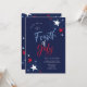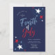El 4 de julio, la Invitación del Partido de los fuegos artificiales del Azul Blanco Rojo presenta estrellas rojas, blancas y azules, detalles de fuegos artificiales y caligrafía moderna.