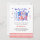 Una divertida invitación a la fiesta del 4 de julio con letras, rayas y estrellas "fiesta en los Estados Unidos" dibujadas a mano.