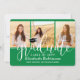 Comparte la alegría de una graduación de secundaria o universitaria e invita a la familia y amigos a celebrar con invitaciones verdes y blancas del collage de fotos personalizado 4. Todas las imágenes y la redacción son simples de personalizar y los colores son fáciles de cambiar con la herramienta de diseño Zazzle. Esta plantilla está formateada para una fiesta de graduación, pero se puede personalizar fácilmente como una invitación a casa abierta o tarjeta de invitación. Simplemente cambie el texto para incluir cualquier detalle de su elección, como los nombres de los padres, honores especiales, título de grado, cita inspiradora favorita, planes de graduación para el futuro o nueva dirección. Si hay algún texto que no se desee simplemente borrarlo. El diseño cuenta con un fondo verde, un gorro de mesa de mortero blanco y negro, caligrafía moderna de escritura a la moda, una tipografía clásica elegante y cuatro fotos de tu elección, como imágenes de la ceremonia de graduación o imágenes de la ceremonia de graduación. Esta tarjeta de invitación para graduación es una manera elegante de anunciar una celebración especial del día. ¡Felicitaciones al graduado!