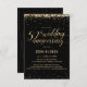 Esta elegante y festiva invitación de 3,5" x 5" para la celebración del 50º aniversario de bodas, cincuenta aniversario, aniversario de bodas de oro, presenta confeti dorado (lámina simulada) con las palabras "50º aniversario de bodas" en una fuente de escritura dorada. El fondo es negro, pero se puede cambiar a cualquier color de su elección. Los detalles de la celebración se pueden personalizar fácilmente para su evento especial. La parte trasera de la tarjeta presenta un patrón de puntos dorados, también con un fondo negro que puede personalizar a su gusto. Una forma hermosa y sencilla de invitar a los invitados a celebrar un aniversario de bodas de oro.