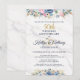 Invitación de celebración de aniversario de bodas número 50 elegante en dorado y azul marino con acentos florales de acuarela en azul marino, dorado, blanco y rosa, tipografía de letra caligráfica y anillos de boda contra un fondo de mármol suave. Todo el texto es editable y se puede utilizar para cualquier aniversario. Contacte al diseñador a través de Zazzle Chat o makeitaboutyoustore@gmail.com si desea que se modifique este diseño, en otro producto o si desea artículos coordinados.