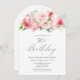 Una hermosa y femenina invitación para celebrar un cumpleaños de estilo elegante. Este diseño floral tiene un borde superior de flores y vegetación de peones rosados encantadores. Esta invitación está disponible como invitación impresa o descarga digital. La forma de arco es una de las tendencias más calientes de invitación de este año.
