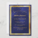Una moderna y moderna tarjeta de invitación para fiestas de 50 años para hombres, hombres, hombres. Un fondo azul oscuro, azul marino. El color azul es desigual. Con un marco de oro falso y un confetti dorado rociado, letras de colores dorados. Plantillas para la información de su fiesta. Fondo azul con salpicadura de confeti.