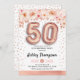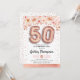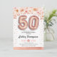 50.ª invitación a la fiesta de cumpleaños. Elegante diseño en falso oro rosa purpurina con acento floral. Invitar tarjeta con rosa de oro número 50 globos, letra de guión con confeti. Rosa de coral Rubor, blanco. Perfecto para una elegante celebración de los cincuenta días. Mándame un mensaje si necesitas edad personalizado.
