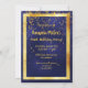 Una célebre y elegante carta de invitación a la fiesta de 50 años. Un color de fondo azul oscuro a medianoche y un marco dorado falso. Con una lluvia dorada de confeti. El color azul es desigual. Delante del texto: ¡50 cumpleaños! y una decoración floral de imitación de oro. Atrás: Plantillas para la información de su fiesta, letras doradas.