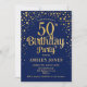 50.ª Invitación a la fiesta de cumpleaños. Elegante diseño en azul marino y falso oro purpurina. Presenta un diseño elegante de tipo de letra y letra de guión. Mándame un mensaje si necesitas edad personalizado.
