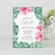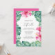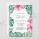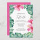 La invitación a la fiesta de cumpleaños incluye vibrantes flores de hibisco tropical rosa fucsia con hojas de palma de monstera. Utilice los campos de plantilla para agregar sus detalles personalizados. Una encantadora elección para un 50 cumpleaños con un tema de luau tropical hawaiano. Arte acuático único de Victoria Grigaliunas de Do Tell A Belle.