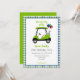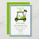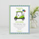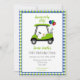 Este diseño de golf de 50 años cuenta con un carrito de golf verde con cerveza y un perro caliente sentado en el asiento, con globos conectados a los clubes de golf. El marco es un patrón tradicional de estilo de golf en azul real y verde.