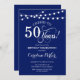 50.ª Invitación de cumpleaños. Diseño sencillo azul marino y blanco con letra de guión y luces de cadena de hadas. Saludos a 50 años. ¡Se puede personalizar en cualquier edad! Mándame un mensaje si necesitas más personalización.