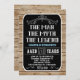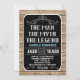 Invitación a los 50 años con texto blanco y azul sobre un fondo negro rodeado de madera. Tenga en cuenta las palabras "El hombre, el mito, la leyenda" y todas las líneas ornamentales NO son editables.