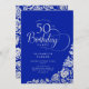 Sencilla y elegante invitación a la fiesta de cumpleaños número 50 en azul real y plata. Diseño elegante con rosas, Relieve metalizado falso plateado y tipo de letra de guión tipográfico. La carta de invitación a la moda es perfecta para una elegante celebración de cumpleaños femenina. Personaliza con tus propios detalles. Se puede personalizar a cualquier edad. Invitaciones Zazzle impresas o una plantilla imprimible digital de descarga instantánea.