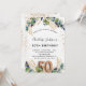 Para una fiesta de cumpleaños número 50. Un fondo blanco decorado con vegetación eucaliptos y hojas doradas. Purpurina falso dorado, chispas. Personalice y agregue sus nombres y detalles del boda. Letras de color negro y dorado. El número 50 se escribe con el tipo de letra de estilo globo. Parte posterior: fondo blanco y chispas purpurinas de imitación doradas.