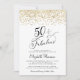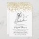 Invitación a la fiesta de 50 años de la moda que incluye "50 & Fabulous" en un guión elegante y un juego de confeti purpurina de imitación dorado.