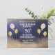 Celebrar el 50 aniversario de la Boda de una pareja especial con esta invitación de la fiesta de oro. Diseñada para un cincuentenario, esta tarjeta está decorada con globos blancos y dorados y confeti dorado sobre un fondo de color azul océano, con texto blanco. Para personalizar, simplemente reemplace el nombre de ejemplo y la información de eventos con nuestra plantilla paso a paso. Asegúrese de ver la pancarta Fiesta correspondiente.