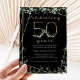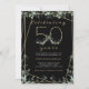 Estas hermosas invitaciones para fiestas del 50 aniversario cuentan con un marco geométrico falso dorado, números y guión con elegante vegetación de acuarela sobre un simple fondo negro oscuro. Una foto boda de la pareja se ve en la parte de atrás.