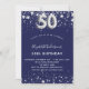 Una invitación moderna, elegante y glamurosa para una fiesta de cumpleaños número 50. Un fondo azul marino, decorado con estrellas de imitación plateadas. Personalice y agregue su nombre y detalles del fiesta. El número 50 se escribe con un tipo de letra de estilo globo.