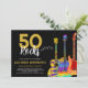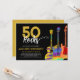 50 Guitarras funky de la fiesta de cumpleaños Rocks genial de oro y invitación negra para él. Roda y roza tu marido, novio, pareja o hermanos de 50 años con esta colorida invitación a la fiesta con temática musical. Guitarra eléctrica única con llama de fuego y guardia de recogida roja, guitarra multicolor semiacústica y ilustraciones de arte psicodélico clásico de guitarra acústica con tipografía moderna de oro. Plantilla fácil de usar crea la invitación personalizada perfecta para celebrar cincuenta en estilo rock and roll y es ideal para un guitarrista, músico y amantes de la música. Cualquier guitarrista te dirá que nunca puedes tener demasiadas guitarras. Este moderno diseño musical de instrumentos musicales celebra la energía musical de este maravilloso instrumento musical y es la manera perfecta de rodar una celebración de 50 años. Pintura original de la artista Catherine Sweetman