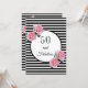 Bandas clásicas delgadas en blanco y negro como fondo. Con rosas rosas rosas como decoración. Un marco delante con el texto: 50 y Fabulous. Atrás: un marco ovalado con plantillas para la información de su fiesta. Una invitación glamurosa y femenina para la fiesta de 50 años.