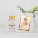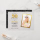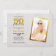 Una invitación moderna para la fiesta de cumpleaños número 50. La foto está en la mitad derecha, en un marco de falso papel de oro.