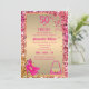 Moderno y elegante, para la invitación de cumpleaños de la fashionista de 50 años. Marco de confeti rosa caliente brillante metálico dorado de lujo glamuroso para mujeres, un par de zapatos de tacón alto hermosos con lazos se sientan en la esquina izquierda y una cartera rosa dorada linda y colorida se sienta en la esquina inferior derecha, "50 & Fabulous" en rosa fucsia caliente sobre lámina metálica dorada y en la parte posterior