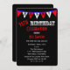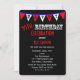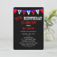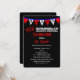 Esta divertida invitación a la fiesta de cumpleaños número 55 incluye un tema de agrupamiento con banderas blancas y rojas con H A P Y dentro sobre un fondo negro. Se utiliza una tipografía divertida para los detalles de cumpleaños para hacer una invitación moderna a una celebración de 55 años para los hombres. Copyright henishouseofpaper