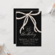 Elegant black and white invitation features large white pearl script bow on a black background.