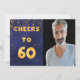 Una moderna invitación a la fiesta de cumpleaños número 60. Con el texto: Saludos a los 60 en la parte delantera escrita con letras falsas de globo de oro. Fondo azul oscuro, color azul desigual. Con confeti dorado. Plantilla para tu foto. Añadir los detalles del evento al reverso. Letras blancas, fondo azul.