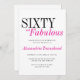 This chic birthday party invitation features a stylish typography heading of 'Sixty and Fabulous', in hot pink and black on a white background. You can replace the text with your name, and details of the party, including the location, date and time. All elements including text and colors can be edited in the Zazzle design tool. ••• For more feminine 60th birthday invitations, visit my store Zazzle.com/EventsByJessicaAmber ••• For custom orders, message me on Zazzle
