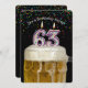 Número 63 velas de cumpleaños en taza de cerveza con confetti colorido en negro para la invitación de la fiesta de cumpleaños número 63.