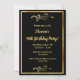 Una moderna y moderna tarjeta de invitación para la fiesta de cumpleaños 70 para hombres y mujeres. Un fondo negro clásico, con letras falsas de color dorado. Plantillas para su información. Decoración en falso dorado con remolinos florales y marco dorado. Atrás: Color negro y decoración dorada
