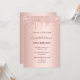 Una invitación moderna, elegante y glamurosa para una fiesta de cumpleaños número 70 de la mujer. Un fondo dorado rosa con goteo. El nombre está escrito con un guión moderno de estilo con letras de color rosa oscuro y dorado. Plantillas para los detalles del fiesta.