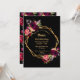 Al frente: Una invitación para una fiesta de cumpleaños número 70. Un fondo negro de moda con un marco geométrico falso dorado. Decorada con flores oscuras de color burdeos y rosa, rosas y plumas de estilo boho. Plantillas para un nombre y detalles del fiesta. El nombre está escrito con un guión de estilo con letras a mano, letras de colores dorados. Fondo negro y grandes rosas exuberantes en burdeos y morado.