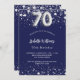 Una invitación moderna, elegante y glamurosa para una fiesta de cumpleaños número 70. Un fondo azul marino, decorado con estrellas de imitación plateadas. Personalice y agregue su nombre y detalles del fiesta. El número 70 se escribe con un tipo de letra de estilo globo.
