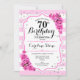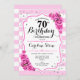 70.ª Invitación de cumpleaños. Elegante diseño rosa rosa rubor blanco con falso purpurina. Rayas blancas y plateadas con rosas rosadas. Perfecto para una elegante fiesta de 70 años.