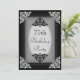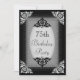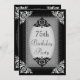 Invitaciones personalizadas de la celebración de la fiesta de cumpleaños del personalizado de las mujeres o de los hombres 75.as. La mujer hermosa, adornada o el hombre echada a un lado doble negra y de plata formal invita para setenta viejos de cinco años/75 años de las fiestas de cumpleaños. Adornado en la parte posterior con con clase, imágenes negras impresas atractivas de la estera del cordón y de las perlas para sus detalles del texto. Moda, invitaciones con clase, elegantes con colores de moda, de moda. Éstos sofisticados, bonito invitan se adornan/se imprimen en ambos lados. OBSERVE POR FAVOR: Todas las invitaciones en Zazzle tienen imágenes impresas del plano. Artwork©delightful-doodles.com original. Estera de la perla por el ©Hazel Kinvig-Paul www.design-a-dream.co.uk. Si usted necesita alguna ayuda que modifica su producto para requisitos particulares me entra en contacto con por favor a través de mi tienda y me placeré ayudar.