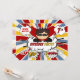 Rojo y azul con amarillo y blanco dan inicio a una invitación de cumpleaños temática de superhéroes para el muchacho amante de los libros de historietas que cumple siete años.