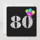 Texto negrita en blanco y negro sobre fondo negro con globos fiestas coloridos para la invitación de la fiesta de cumpleaños número 80.